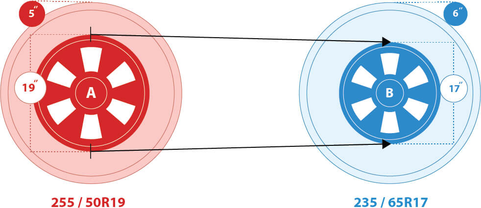 In the figure above, Wheel B has a smaller diameter than Wheel A. However the overall diameter of Tire/Wheel Assembly B(29") is the same diameter as the Tire/ Wheel Assembly A(29"). This is because the tire used in assembly B has a higher sidewall height(6") than the tire used in assembly A(5”). This approach of combining a smaller diameter wheel with a higher sidewall tire to maintain the same overall diameter is called downsizing or minus sizing.